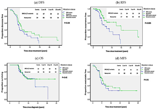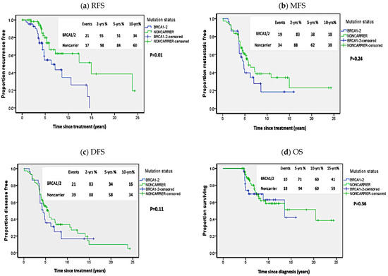 Kaplan Meier plots of survival analysis in carriers of all BRCA1/2 variants. (a) Disease-free survival (DFS), (b) Recurrence-free survival (RFS), (c) Overall survival (OS), (d) Metastasis-free survival (MFS). p-values calculated by log-rank test (considering whole follow-up period).