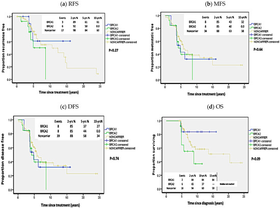 Kaplan Meier plots of survival analysis in carriers of BRCA1 and BRCA2 mutations independently and non-carriers. (a) Recurrence-free survival (RFS), (b) Metastasis-free survival (MFS), (c) Disease-free survival (DFS), (d) Overall survival (OS). p-values calculated by log-rank test (considering whole follow-up period).