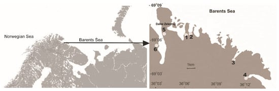 The northwest Murman coast is characterised by the presence of rocky areas and fjords and is covered with vegetation characteristic of the sub-Arctic tundra []. The climate of the Murman coast is rather mild because of the Gulf Stream and is characterised by a humid, cool summer and a relatively mild winter, so the frost-free season lasts about 120 days []. The warmest month is July, and the average temperature ranges from 9 to 11 °C; the coldest month is February, which is characterised by an average temperature of about −10 °C []. The annual precipitation ranges from 300 to 400 mm []. The territory is affected by strong winds and drastically changeable weather []. The average temperature, precipitation and wind force in July 2010 and 2013 are given in Table 1.