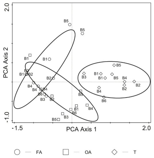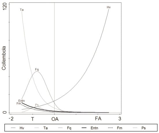 The pure environmental effect of location (B) and habitat (H) was significant (Monte Carlo permutation test p = 0.002) and explained 30.7% (adj. 14.2%) and 30.0% (adj. 24.3%) of the variation, respectively, while variation uniquely attributable to time (Tm), although significant, explained less variation in collembolan communities (10.1%) (adj. 5.8%). The results of pCCA revealed a significant species–environment relationship across the environmental gradient. For instance, Protaphorura bicampata and Agrenia bidenticulata were associated with OA, while Isotoma anglicana and Hypogastrura viatica showed a positive correlation with FA (Figure 3).