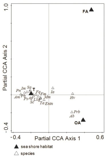 We noted that inundated by tidal water, FA were colonised only by two epigeic and fast-moving collembolan species: Hypogastrura viatica and Isotoma anglicana. Both species are considered superhydrophobic []. Hypogastrura viatica is a cosmopolitan species preferring moist habitats [], and it is resistant to salinity, adapted to regular flooding [,,] and frequently found along the seacoast [,], while Isotoma anglicana prefers wet habitats and is commonly found in polar and subpolar areas []. The OA, in total, were colonised by a much higher number of epigeic and fast-moving species of Collembola (nine species). Further CCA results revealed that the taxa highly (exclusively) associated with OA were Protaphorura bicampata, a species characteristic of wet habitats, such as sea meadows and wrack deposits [], and Agrenia bidenticulata, a species common in damp Arctic tundra, mostly littoral [] and tolerant to short-term flooding by sea waters []. Surprising was the absence of Archisotoma megalops, a littoral, fast moving species [] in macroalgae, especially that was present in the tundra. The absence of this species in the macroalgae patches could be related to either the involved abundance based, not activity-based method or it could be related to its lower density and higher activity in the investigated habitats, or in combination.