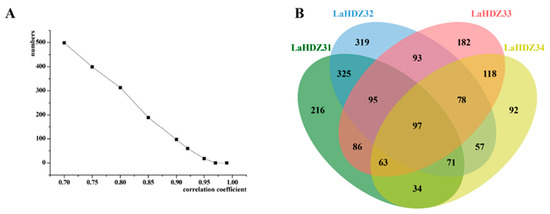 3.6. Pearson’s Correlation Analysis of DEGs Related to the Expression of LaHDZ31–34 in Response to LaMIR166a Overexpression