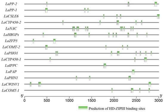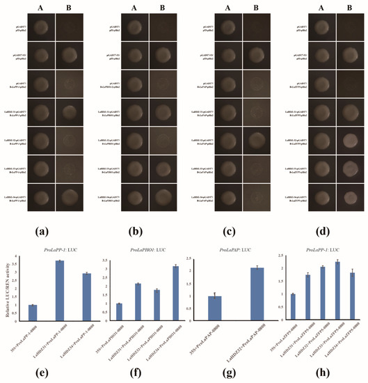 3.7. LaHDZ31–34 Bind to the Promoters of LaPAP, LaPP1, LaZFP5, and LaPHO1