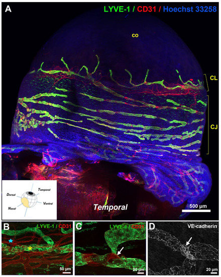 - Wu, Y.; Seong, Y.J.; Li, K.; Choi, D.; Park, E.; Daghlian, G.; Jung, E.; Bui, K.; Zhao, L.; Madhavan, S.; et al. Organogenesis and distribution of the ocular lymphatic vessels in the anterior eye. JCI Insight 2020, 5, 5. [Google Scholar] [CrossRef]