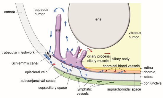 - Kiel, J.; Hollingsworth, M.; Rao, R.; Chen, M.; Reitsamer, H. Ciliary blood flow and aqueous humor production. Prog. Retin. Eye Res. 2011, 30, 1–17. [Google Scholar] [CrossRef]