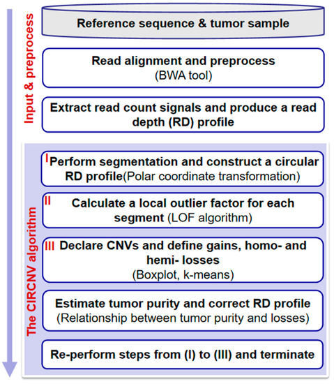 The flowchart of the CIRCNV method is depicted in Figure 1. It starts with the input of an RD profile of one tumor sample and goes through three major steps to discover CNVs. These steps are re-performed to improve the accuracy of CNV detection by carrying out an estimation of tumor purity and a correction of the RD profile. These steps include: (1) performing a segmentation process on the observed RD profile and constructing a circular RD profile by using polar coordinate transformation; (2) calculating a local outlier factor for each segment; (3) declaring CNVs and defining gains and homogeneous (homo-) and heterogeneous (hemi-) losses. In the following text, we present a detailed description of the input RD profile, the aforementioned four steps, estimation of tumor purity, and correction of the RD profile.