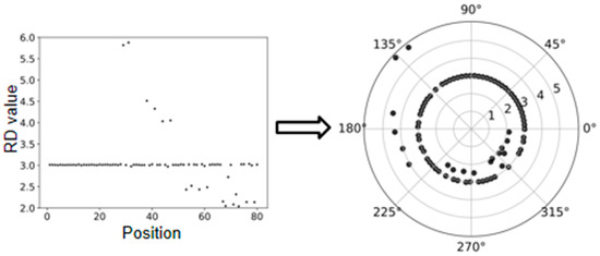 For convenience, we denote the segment-based RD profile as , where n represents the total number of segments and represents the i-th segment. is composed of a two-tuple (), where represents the segment position (i.e., index) and represents the RD value of the i-th segment. We then adopt a polar coordinate transformation to transfer from a line shape to a circular-shaped RD profile, denoted as . Similarly, is composed of a two-tuple (). The transformation formula is expressed as shown below.