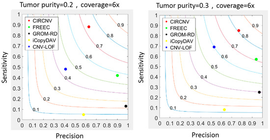 Furthermore, we may note that the sensitivity, precision, and F1-score of almost all five methods are improved when the tumor purity level in the simulation data is increased. For example, the F1-score of CIRCNV is around 0.7 in the simulation configuration of tumor purity of 0.2, and it reaches over 0.8 under tumor purity of 0.3. This is because a large tumor purity value can increase the signal ratio of the tumor genome to the normal genome and thus facilitate the detection of CNVs. More analysis results about the tumor purity influence on CNV detection can be found in [41].