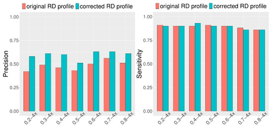 Performance comparisons between the first-round (using original RD profile) and the second-round (using corrected RD profile) CNV detected by the CIRCNV method with respect to sensitivity and precision. The simulation tumor purity ranges from 0.2 to 0.8, and the sequencing coverage depth is 4×.