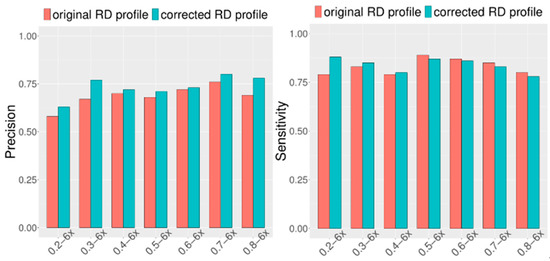 Performance comparisons between the first-round (using original RD profile) and the second-round (using corrected RD profile) CNV detected by the CIRCNV method with respect to sensitivity and precision. The simulation tumor purity ranges from 0.2 to 0.8, and the sequencing coverage depth is 6×.