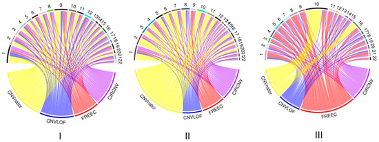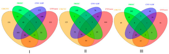 Venn diagrams to show the overlapping and non-overlapping CNVs between each pair of methods for each of the three tumor samples, EGAR00001004802_2053_1 (I), EGAR00001004836_2561_1 (II), and EGAD00001000144_LC (III).