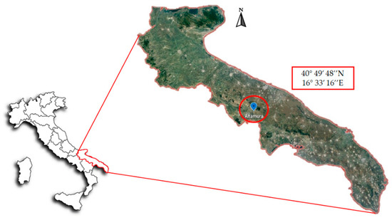 The experiment was conducted in a monoculture of durum wheat (Triticum durum Desf.) field in the south of Italy (Apulia Region) near the town of Altamura (Figure 1), amended for more than 10 years by low-quality compost derived from tannery waste sludges, as described by Gattullo et al. (2020) [14]. The soils in this area are classified as Calcaric Leptosols, according to WRB classification [15].