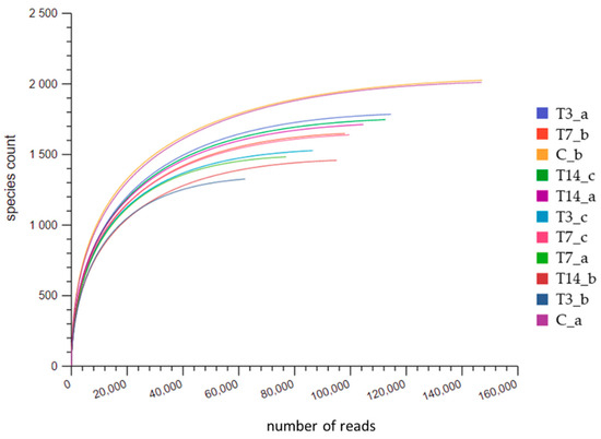 Rarefaction curves relative to the number of sequences and OTUs associated with each soil sample. C are the control unheated samples; T3, T7, T14 are the thermally treated samples after 3, 7 and 14 days of incubation, respectively; a, b, c are the replicates.