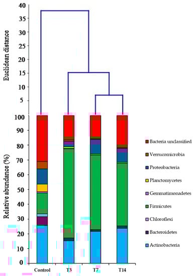 Relative abundances of the dominant bacterial phyla (>1%) and cluster analysis of control, T3, T7 and T14 samples using Ward’s method.
