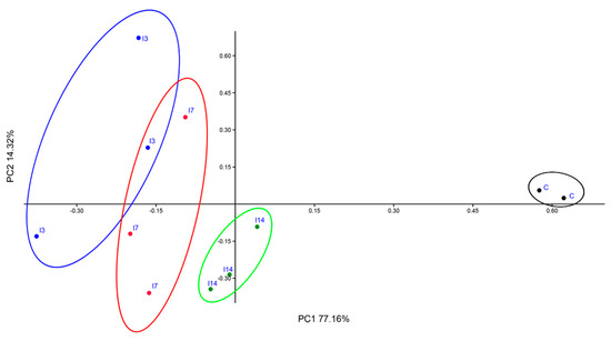 PCoA better illustrates the differences between the structure of bacterial communities associated with the control (C), T3, T7 and T14 soil samples (Figure 4). The two-dimensional plot revealed a clear segregation of C from T3, T7 and T14 samples. The first axis, accounting for about 77% of the variance, highlighted the differences between the T3, T7 and T14 and the control soil. The second axis (~14%) separated C from T14 well.