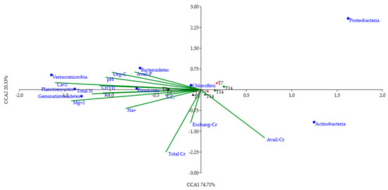 Canonical correspondence analysis (CCA) aimed at explaining the relationships between the most abundant phyla (relative abundance ≥ 1%) and selected environmental variables (soil parameters) of the T3, T7 and T14 samples. The selected soil parameters were: pH, EC, base cations, organic C, total N, available P, total Cr, DTPA-extractable Cr, total Cr(VI), and exchangeable Cr(VI). Most of the total variance (95%) was accounted by seven axes and explained by the first two components (Figure 5). The first axis, accounting for about 75% of variance, clearly discriminated T3 from T7 and T14. A further division within these three main clusters accounted for about 20% of variance by the second axis.