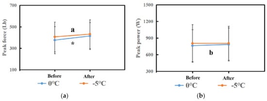 (a) The comparison of peak force in each phase between the 0 °C and −5 °C groups. (b) The comparison of peak power in each phase between the 0 °C and −5 °C groups. Note: * means that there are significant differences between Before and After in peak force in the 0 °C group. The “a” means that there are significant differences between Before and After in peak force in the −5 °C group. Moreover, the “b” means that there are significant differences between Before and After in peak power in the 0 °C group.