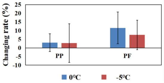 Comparisons of changing rates of PP and PF between 0 °C and −5 °C cryotherapy are displayed in Figure 4. The changing rate of PP (3.03%) and PF (11.51%) in the 0 °C group were higher than PP (2.80%), as well as PF (7.45%), in the −5 °C group.