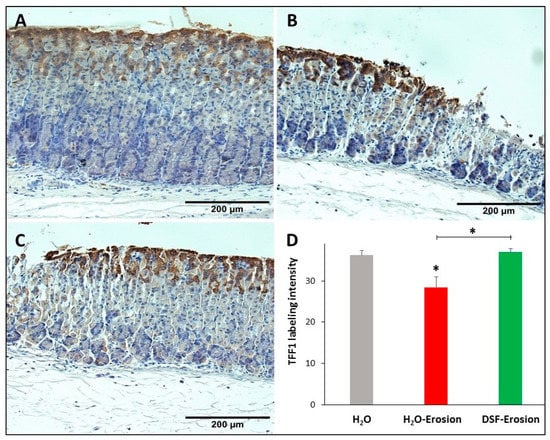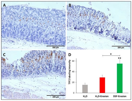 - Farrell, J.J.; Taupin, D.; Koh, T.J.; Chen, D.; Zhao, C.M.; Podolsky, D.K.; Wang, T.C. TFF2/SP-deficient mice show decreased gastric proliferation, increased acid secretion, and increased susceptibility to NSAID injury. J. Clin. Investig. 2002, 109, 193–204. [Google Scholar] [CrossRef]