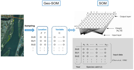 Geo-SOM was designed to specifically reveal the interrelationships among variables, in association with geographic locations. Compared to the original SOM, the location data (e.g., longitudes and latitudes, expressed as ‘X’ and ‘Y’, respectively) are provided as input (left panel, Figure 3). Geo-SOM training is conducted in two phases: initial location information is provided, and then a geographical vicinity is searched for the best matching unit (BMU). The weight of the spatial information is controlled by the geographic tolerance (k; between 0 and 5 in this case), with the lower level indicating a higher weight of the geographic information. Based on preliminary tests, k = 3 was selected for training in this study. After selecting the sample units using geographic tolerance, additional training was conducted using new variables (environmental factors and biological data in this study) for the second phase of the Geo-SOM [49,50].