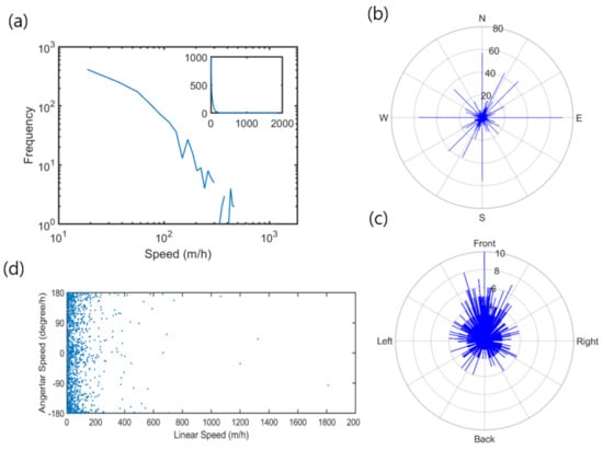 Linear and rotating movement parameters of nutria individuals observed in the Macdo wetland during the survey period; (a) frequencies of linear speed in logarithm (inset showing frequencies of linear speed in full scale); (b) orientation; (c) angular speed; and (d) the relation between linear and angular speed.
