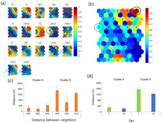 Association of covariates and comparison of neighbor distances for all individuals according to Geo-SOM (k = 3). (a) neighbor distances in association with environmental and biological factors on the component map (k = 3), (b) clustering, (c) nearest distances between different and same sex, and (d) between either females or males. Values in all component maps were normalized between 0.0 and 1.0, as shown in the vertical bar. Water temperature: WT; open area: OA; artificial structure: AS; road: R; hydric herbaceous vegetation: HHV; tall grassland: TG; xeric herbaceous vegetation: XHV; hydric woody vegetation: HWV; floating-leaved hydrophytes: FL; sex ratio: SR; linear speed: LiS; angular speed: AnS; distances between all neighbor individuals: DAS; distances be-tween neighbors with the same sex: DSS; and distances between neighbors with different sexes: DDS. Cluster 4 indicates the minimum distances between neighbors, whereas Cluster 5 provides the maximum distances according to the Geo-SOM training. Mean ± standard deviations are 255.6 ± 186.3 m, 200.5 ± 140.1 m, and 451.8 ± 179.9 m for Cluster 4 (n = 381), and 1493.6 ± 309.8 m, 653.7 ± 630.0 m, and 1303.6 ± 383.1 m for Cluster 5 (n = 219) for DSS, DDS, and DAS, respectively, in (c). Mean ± standard deviations are 299.9 ± 210.4 m (n = 169) and 220.4 ± 155.7 m (n = 212) for Cluster 4, and 1538.9 ± 293.8 m and 1228.8 ± 265.0 m for Cluster 5 for F and M, respectively, in (d).
