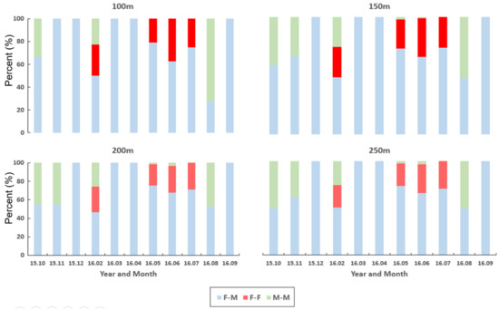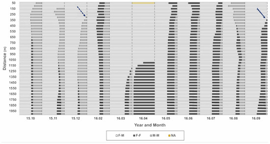 To determine the distance for observing the local co-occurrence of neighbor individuals, all distances from each individual to nearest neighbors were checked across 50 m to 2000 m in a radius from the individual position (Y-axis, Figure 7), according to different months of the survey period (X-axis, Figure 7). A similar trend in co-occurrence was observed in the short-range up to 250 m. At 300 m, M-M co-occurrence appeared newly in December 2015 (dotted arrow, Figure 7) and increased continuously afterward. At 350 m, F-F co-occurrence was newly observed in September 2016 (solid arrow, Figure 7), increasing afterward continuously. In March and April 2016, co-occurrences of the same sex (F-F and M-M) were found in broad ranges beyond 1100 m. Considering the co-occurrence pattern persisted until 250 m and changed afterward, 250 m was used as the distance for further determining the local co-occurrence of individuals in this study.