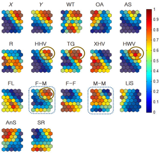 The component maps further demonstrate the co-occurrence of individuals (<250 m) associated with environmental and biological factors according to sex (Figure 10). By matching both global profiles and local compositions on the component map of the Geo-SOM, the levels of association were observed. Overall, co-occurrence patterns were more strongly observed in association with plant types than minimum neighbor distances, as shown in Figure 5. When females were used as the target sex for training, F-M co-occurrences were associated with TG (#16, and #19), XHV (#20 and #22), and HHV (#16) (dotted circles, Figure 10a). Regarding F-F co-occurrences, FL (#16 and #19), XHV (#10 and #19), and TG (#22) were related to the maximum incidence (dashed circles, Figure 10a).