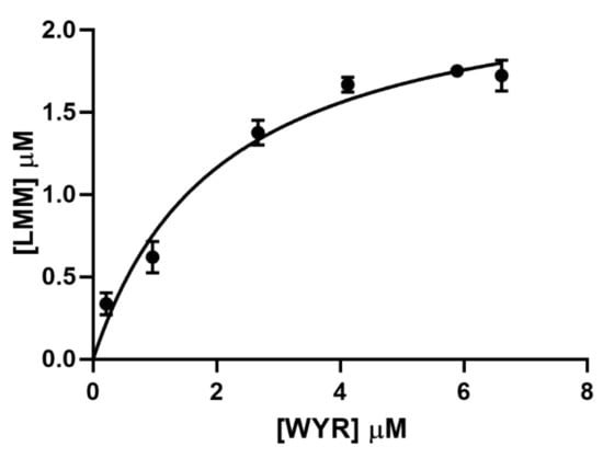 Samples were measured at 25 °C using a Jasco J-1700 spectropolarimeter at a scanning-speed of 20 nm/min with a digital integration time (DIT) of 8 s and bandwidth of 0.5–1 nm over six accumulations, minimally from 260–190 nm on continuous scan mode. A minimum n = 6 was used for measurements of the experimental combination of LMM and WYR and an n = 10 for WYR alone in 215 mM NaF, 20 mM Sodium Phosphate, pH 7, 1 mM TCEP. Wavelengths at maxima and minima, as well as θ222/208 and θ192/208 ellipticity ratios were recorded for all spectra. Structural interpretations were generated using BeStSel, after conversion to Mean Residue Ellipticity (MRE), for the range of 190–250 nm [,]. While other analysis programs exist, BeStSel is best suited for non-helical proteins of more unusual structure through both its diverse eight element modelling and inclusion of a basis dataset that incorporates proteins with rare secondary structures. BeStSel was most appropriate given the non-helical profile of WYR along with its high aromatic content and presence of proline.