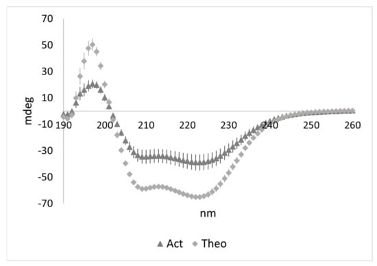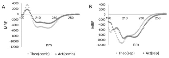 Using a variety of methods for estimation of helical content [,,,,,,], we obtained a range of helicities from 5–23.7% for Act(comb) and 14.1–45.6% for Act(sep) compared to 15.1–29.8% for Theo(comb) and 19.3–51.6% for Theo(sep), respectively (Table 2).