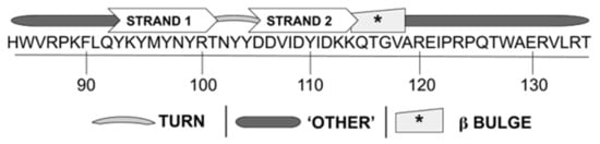 ‘Other’ content may also include some turn content as there can be overlapping turn segments in loops as in other turns, similar to β turns encompassing Asx turns. Pi-turns (n = 6; i, i + 5 H bonding) are most often present at the end of helical structures and often internalize a β-turn or are composed of multiple types of β-turns [] as do over 30% of smaller α-turns []. Pi-turns are not likely for any part of WYR, partially due to the absence of helical content but also due to a general lack of glycines, strongly preferred in π-turns. Aromatics, of which there are many in WYR, are preferred at π-turn positions at i − 1, i + 6, but are also not appropriately positioned to other π-turn preferred residues that do exist within the WYR sequence. Loop structure on the outskirts of the central antiparallel β content (Q92-K114), however, could include γ-, β- or α-turn content.