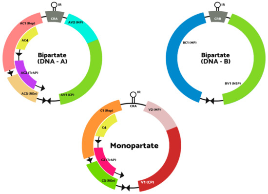 Bipartite Begomovirus contains two components in their genomes: the DNA-A and DNA-B with a size of 2.5–2.6 kb. DNA-A is the part that makes proteins responsible for functions like replicating the virus, encapsidation of both genomic molecules and viral gene expression regulation. However, DNA-B creates the protein responsible for the mechanism of viral DNA molecules in and among the host cells [13]. DNA-A components in the genomes can replicate autonomously. However, it needs DNA-B components for systemic infection to occur. The intergenic region of DNA-A and DNA-B consists of about 200 bp of conserved sequence (Common Region (CR)), including the TAATATTAC sequence v-ori in the conserved stem-loop. The monopartite Begomovirus genome organization resembles the DNA-A component in the bipartite Begomovirus genome [14]. Figure 1 shows the structure genomes of Begomovirus (adapted from the 10th online report of the International Committee on Taxonomy of Viruses (ICTV)).
