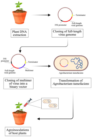 The availability of infectious clones for begomoviruses has proven to be a powerful molecular tool. This technique allows the functional study of a viral gene and its biological properties, and facilitates the genetic screening of germplasm for resistance to viruses. The agroinoculation of viral clones using Agrobacterium tumefaciens and its binary vectors is a cost-effective and highly efficient method for analyzing the Begomovirus’s infectivity. Thus, it is widely used by virologists. To date, the processes for producing a full-length infectious clone construct have been simplified and continuous developments of kits and methodologies have been made available to allow a better understanding of viral infectivity.