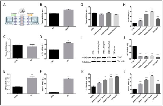 GEVS configuration and DNBS-stimulated tissue stress and altered permeability. (A) GEVS schematic representation in which the configuration of chambers is highlighted. (B) Tissue viability of colon cultivated 5 h in the gut-ex-vivo system (GEVS) or freshly explanted (E,F). The colon was cultivated 5 h in the GEVS and untreated (CTRL) or treated with Thapsigargin (TG), and tissue viability was evaluated by MTT Assay (C), or total RNA was isolated and ATF4 (D), ATF6 (E) or spliced XBP1 (XBP1s, (F)) expression levels were evaluated by qPCR. Colon was cultivated 5 h in a GEVS and untreated (CTRL) or treated with the indicated concentrations of DNBS, or Thapsigargin (TG), tissue viability was evaluated by MTT assay (G) and cellular stress was evaluated by measuring the expression of TG2, by qPCR (H) and western blotting analysis (I). Tissue permeability was evaluated by measuring the mRNA levels of Tight Junction (TJ) components Occludin (OCL, (J)), Claudin-2 (CLD2, (K)), or Claudin-15 (CLD15, (L)), by qPCR. Each panel is representative of experiments performed in triplicate. Histograms represent mean ± SD of triplicate sample; **** p < 0.0001; *** p < 0.001; ** p < 0.01.