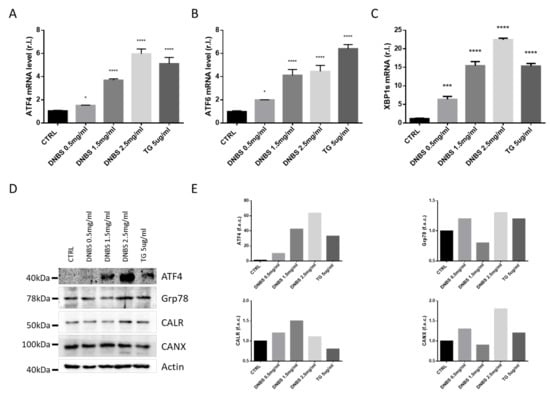 Therefore, we evaluated the expression of key ER stress markers, such as ATF4 (Figure 2A,D,E), ATF6 (Figure 2B), spliced XBP1 (XBP1s; Figure 2C), Grp78, Calreticulin (CANR), and Calnexin (CALX; Figure 2D,E) [20,21], in colon tissues cultivated 5h in our GEVS, in presence or absence of DNBS, using TG as a positive control [21]. To this aim, the mRNA or protein levels of these markers were evaluated by qPCR or western blotting analysis, and data reported in Figure 2 clearly show a DNBS-dependent upregulation of all the unfolded protein response (UPR) markers.
