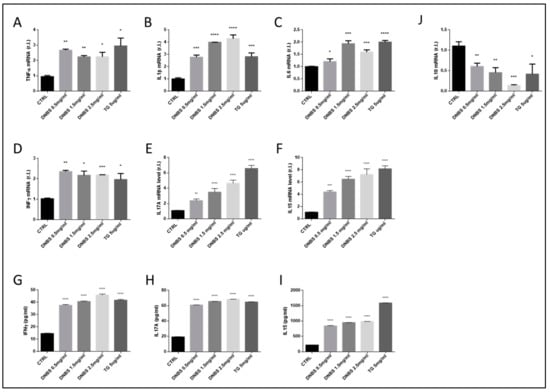 To evaluate the ability of DNBS to stimulate the expression of both pro- and anti- inflammatory cytokines in the colon after 5 h of treatment (in a GEVS), we measured the mRNA and protein levels of these factors, by qPCR and ELISA (TG was used as a control). Data indicate both an enhanced expression of pro-inflammatory cytokines and downregulation of anti-inflammatory cytokines (Figure 3). Indeed, we observed a prompt upregulation of TNFα, IL1β, IFNγ, IL15, and IL17A, starting from the lowest DNBS concentration (0.5 mg/mL), while a consistent upregulation of IL6 expression was evident from 1.5 mg/mL DNBS, at least at mRNA levels. Furthermore, these data were confirmed by an analysis of the protein levels of IFNγ, IL15, and IL17A, by ELISA, which demonstrate a consistent production/release of these cytokines starting from the lowest DNBS concentration (Figure 3G–I). Finally, these results were in line with the down-regulation of the anti-inflammatory IL10 (Figure 3J).
