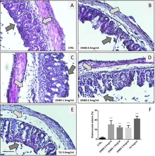 Altered morphology of colon treated with DNBS. Tissues (colon) were cultivated 5 h in the GEVS in absence (CTRL; A) or presence of DNBS 0.5 (B), 1.5 (C), 2.5 mg/mL (D), or with TG 5 μg/mL (E), and tissue morphology was evaluated in sections stained with H&E (magnification = 40×; bar = 100 μm). Dark and light grey arrows indicate the luminal epithelia and the submucosa, respectively. (F) Submucosal edema was evaluated as a percentage of edema thickness relative to the thickness of the colon section. Histograms represent mean ± SD of about 10 measurements/experimental condition; **** p < 0.0001.