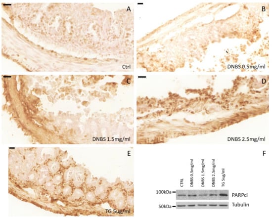 Tissue damage. Tissues (colon) were cultivated 5 h in the GEVS in the absence (CTRL; A) or presence of DNBS 0.5 (B), 1.5 (C), 2.5 mg/mL (D), or with TG 5 μg/mL (E), and cell death was evaluated by TUNEL assay. (F) Part of the tissues were homogenized and total proteins were separated by SDS-PAGE. The membrane was incubated with anti-cleaved PARP. Tubulin was used as a loading control.