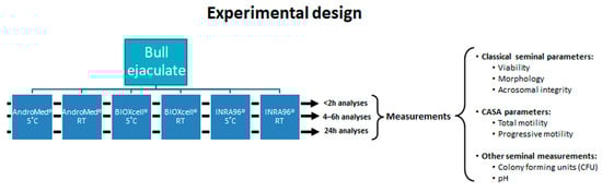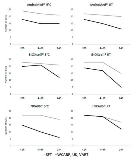 Semen samples were evaluated in the laboratory in the following sequence: first AndroMed® samples, then BIOXcell® samples, and finally INRA96® samples. This sequence was followed for the room temperature and 5 °C samples. Assessments occurred about 5 min apart.