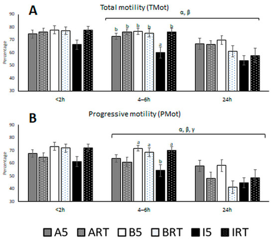 (A) Bull sperm total motility (percentage) and (B) progressive motility (percentage) after three storage durations in the presence of three semen extenders at two holding temperatures. Aliquot abbreviations: A: AndroMed®; B: BIOXcell®; I: INRA96®; RT: room temperature; 5: refrigeration at 5 °C. Factors abbreviations: t: time; Temp: temperature; Ex: extender; α: interaction temperature by extender; β: interaction temperature by time; γ: interaction extender by time; δ: interaction temperature by extender by time. Bars with different letters denote significantly different values (p < 0.05) among the six aliquots of the three extenders by two holding temperatures at each fixed time window (ANOVA). Bars without letters were not significantly different. Square bracket over the bars highlights a significant effect (p < 0.05; from generalized linear mixed model analyses) of the factor or factor interactions by time. The bracket covers the time window where the effect is significant (from <2 to 4–6 h, from 4–6 h to 24 h, or from <2 to 24 h).