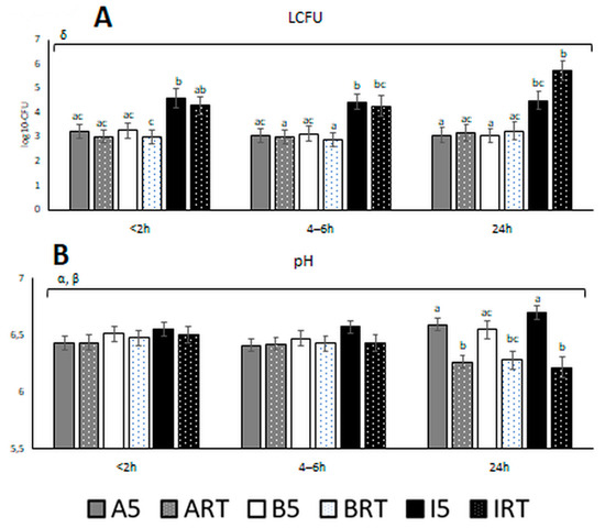 (A) Microbiological quality (log10-CFU) and (B) pH of bull semen at three different assessment time windows after semen collection, using three different semen extenders and two holding temperatures. Aliquots abbreviations: A: AndroMed®; B: BIOXcell®; I: INRA96®; RT: room temperature; 5: refrigeration at 5 °C. Factors abbreviations: t: time; Temp: temperature; Ex: extender; α: interaction temperature by extender; β: interaction temperature by time; γ: interaction extender by time; δ: interaction temperature by extender by time. Bars with different letters denote significantly different values (p < 0.05) among the six aliquots of the three extenders by two holding temperatures at each fixed time window (ANOVA). Bars without letters were not significantly different. Square bracket over the bars highlights significant effect (p < 0.05; from GLM analyses) of the factor or factors interactions during the time referred to with Greek letters. The bracket covers the time window where the effect is significant (from <2 to 4–6 h, from 4–6 to 24 h, or <2 to 24 h).