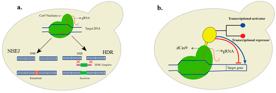 Genetic engineering in yeast using CRISPR/Cas9. (a). Cas9, together with guide RNA, induces a double-stranded break (DSB). The DSB is repaired by the cell either through the error-prone non-homology end joining (NHEJ) or in the presence of repair fragments with homology arms; foreign DNA is inserted into the DNA through homology-directed repair (HDR) mechanism. (b). The nuclease deficient (dCas9) is fused with a transcriptional regulator (yellow color). In the case of a transcriptional activator (blue), the targeted gene is activated, while in the case of a transcriptional repressor (red), its transcription is deactivated.