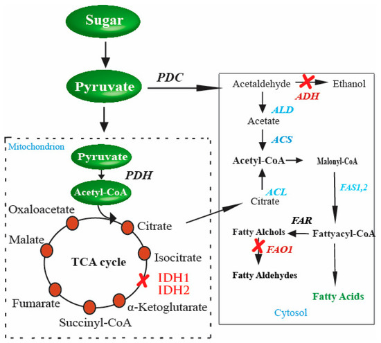 The possible way for the metabolic improvement of acetyl-CoA production, as proposed by [120], is first to increase the amount of citrate accumulated in the tricarboxylic acid cycle (TCA cycle), and then transport the excess of citrate in order to generate cytosol acetyl-CoA. This is a promising pathway to provide precursors for FA biosynthesis. Another aspect of the improved production of FAs in S. cerevisiae is citrate catabolism. During the TCA cycle, citrate catabolism is performed by an enzyme of mitochondrial origin, isocitrate dehydrogenase. The enzyme is coded by two distinct genes, IDH1 and IDH2 [121]. The accumulation of citrate is directly linked to its consumption and hence to the enzyme activity, i.e., if the enzyme activity is high, there is less accumulation of citrate and less chance of producing a high amount of acetyl-CoA. To achieve high production, the enzyme activity needs to be reduced. This is performed by disturbing the genes IDH1 and IDH2 separately, and then the effect on citrate accumulation is measured compared to the wild-type strains. The double gene disturbance resultantly yielded a 4 to 5-fold enhancement in citrate level in the media. This suggested that since two genes and those genes code, the enzyme that catalyzes citrate was disturbed in the process, resulting in the net increase in citrate accumulation in the media [65].