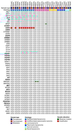 - Cote, G.M.; He, J.; Choy, E. Next-Generation Sequencing for Patients with Sarcoma: A Single Center Experience. Oncologist 2017, 23, 234–242. [Google Scholar] [CrossRef]