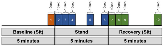 Overview of the epochs that we defined and used for data analysis. Several key epochs were examined (191): (1) final 10 s of sitting baseline, (2) 0–10 s, (3) 10–20 s, (4) 20–30 s, (5) 290–300 s, and (6) final 10 s of stand phase, as well as (7) initial 0–10 s, (8) 10–20 s, (9) 20–30 s, and (10) final 10 s of sitting recovery.