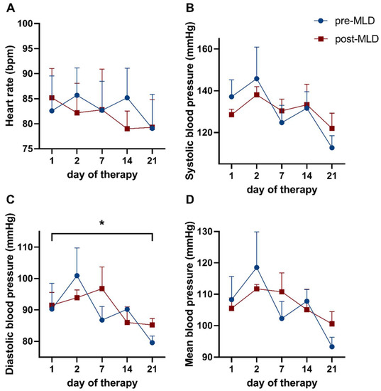 Time course showing baseline hemodynamic parameters over three weeks of complete decongestive therapy (CDT), before and after manual lymphatic drainage (MLD). Displayed are (A) heart rate, as well as (B) systolic, (C) diastolic, and (D) mean blood pressure. Data before MLD are depicted as blue dots; values after MLD are shown as red circles. Asterisks mark significant differences (*). Note: ticks on the x-axis (day of therapy) are not spaced equally in time.