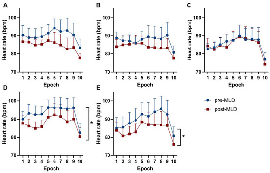 Responses of heart rate during distinct epochs of a sit-to-stand test throughout Table 1. (A) day 1, (B) day 2, (C) day 7, (D) day 14, and (E) day 21 of lymphedema therapy. The blue dots show data before MLD. Red boxes reflect data after MLD. Significant differences in heart rate pre- vs. post-MLD are labeled with asterisks (*).