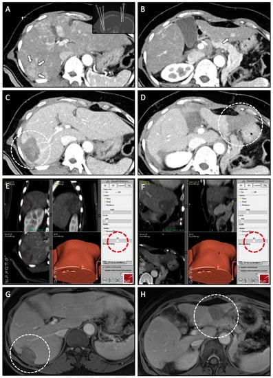 Case of a 57-year-old male with simultaneous treatment of two HCCs (right and left liver lobe) using SRFA. (A,B) Planning CT scan in arterial phase of the SRFA procedure with a 30-mm HCC nodule in liver segment VI (white arrows) and a 9-mm HCC nodule in liver segment III (white arrow); Maximum Intensity Projection (MIP) of the non-enhanced control CT scan showing the position of seven coaxial needles in the upper right corner of (A). (C,D) Control CT scan after ablation with corresponding necrosis zones in liver segment VI and III (white dashed circles). (E,F) Three-dimensional views of the intraprocedural image fusion of the contrast-enhanced planning and final control CT scan using the rigid-registration tool from the navigation system with the possibility to switch between images using the blending function (red dashed circle); verification of complete necrosis including a sufficient safety margin. (G,H) Follow-up MRI scan 18 months after SRFA, showing no evidence of LTP with shrinking necrosis zones (white dashed circle).