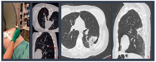 Percutaneous lung MW ablation of a breast cancer metastasis: needle and patient tools positioning (A); the navigation system, creating a 3D virtual model of the patient’s chest, where needle progressions into the patient’s chest are shown (B); post procedural MPR CT reconstructions displaying a small PNX adjacent to the ablation zone, without evidence of residual disease (C,D).