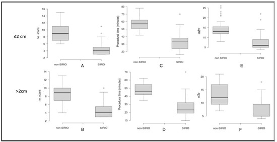 On the other hand, for lesions >2 cm we report the mean procedural time of 47.3 ± 8 min, the mean number of CT scans of 8.5 ± 2.2, and a mean radiation dose of 13.3 ± 4.3 mSv for the non-SIRIO group, while, for the SIRIO group, we report 27.2 ± 13.8 min, 4.7 ± 2 CT scans, and 7 ± 4 mSv, respectively. Boxplots of the three variables for each group are shown in Figure 2.